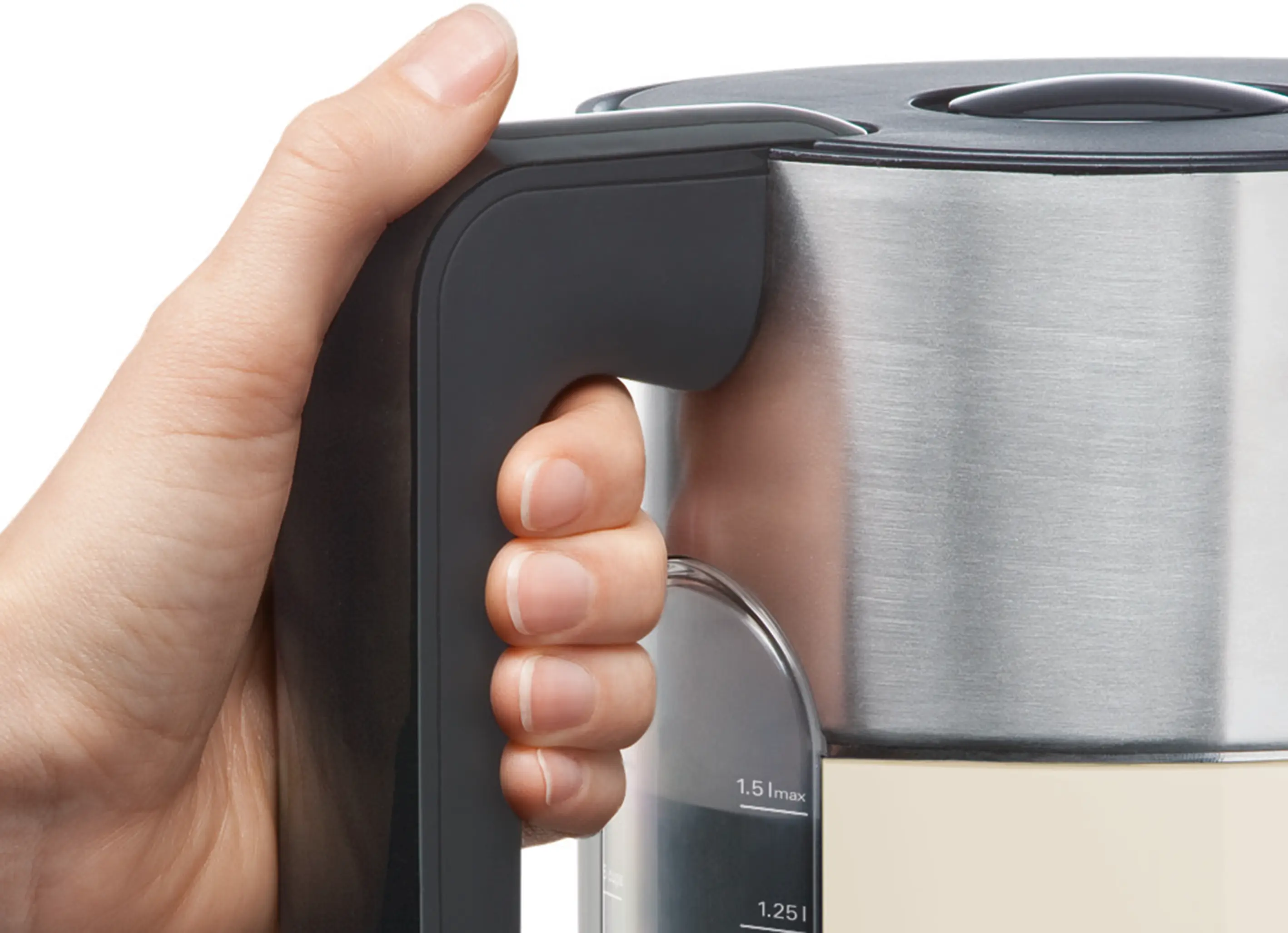 Easy-to-read water scale on both sides: visiblity of the amount of water on both sides of the kettle – convenient for left and right handed users.