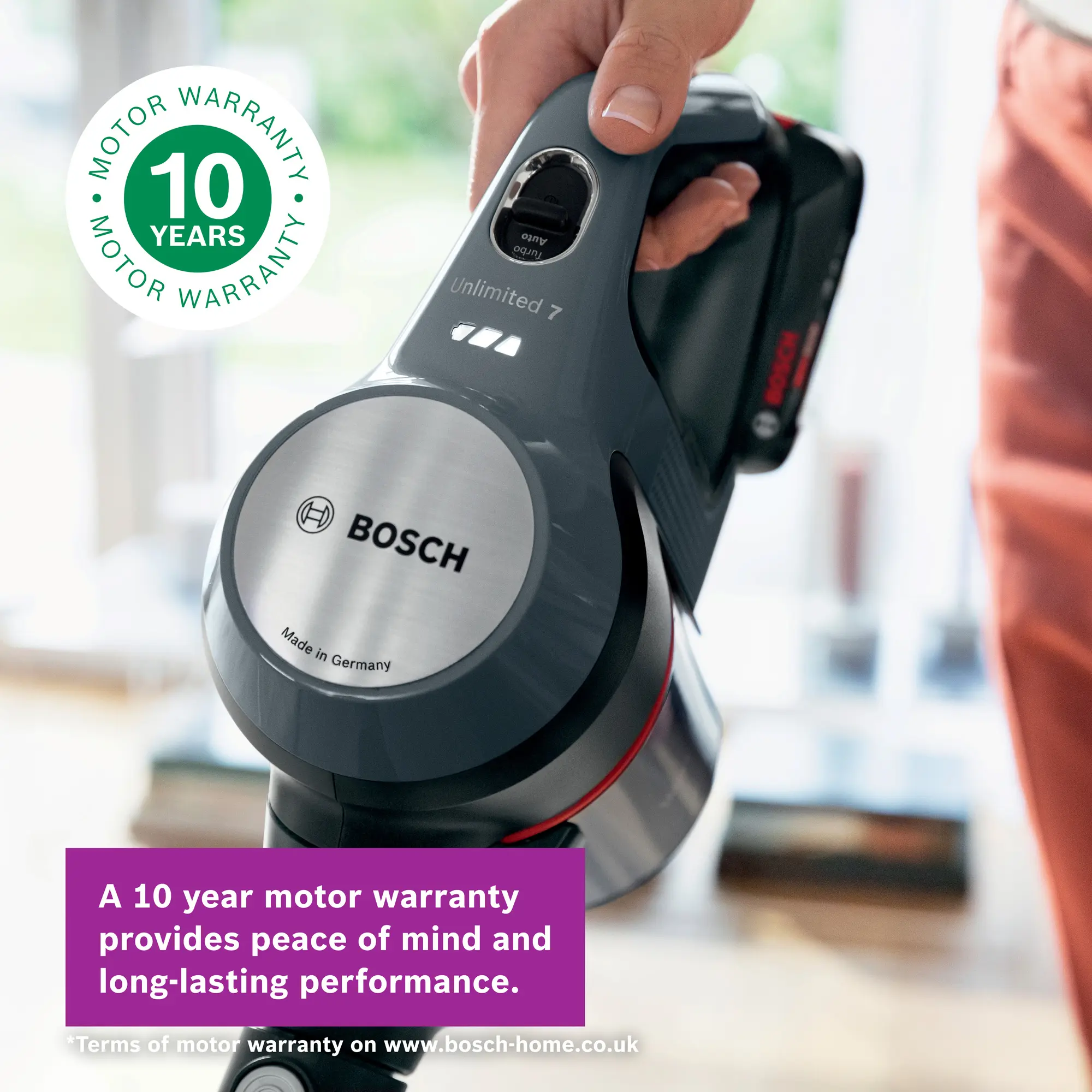 10 year motor guarantee Footnote 1: Terms of warranty on https://www.bosch-home.co.uk/customer-service/warranty